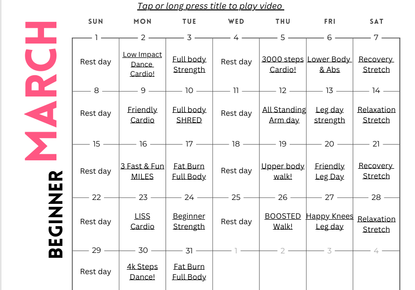 🖱 Clickable Workouts – Tap each day to go straight to the YouTube video. No searching!