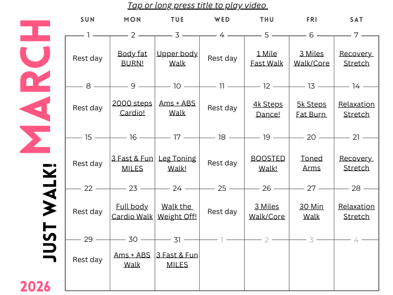 See How I Lost Over 40LBS With YouTube Videos! Take the guesswork out of fitness and stay consistent with your goals with the Monthly At-Home Workout Calendar for those who want to JUST WALK! Created by a mom who lost over 40lbs using simple YouTube workouts, this calendar gives you a clear daily plan so you can focus on results, not confusion. Whether your goal is weight loss, toning, or boosting energy, this calendar helps you stay on track with structured workouts you can do at home.